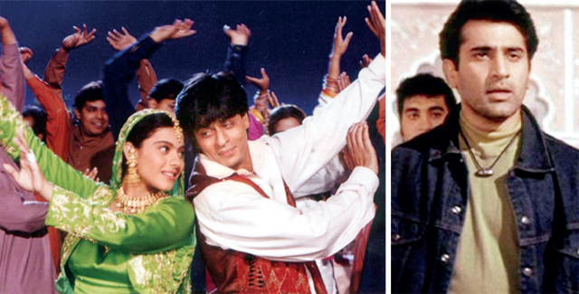 Kajol and Shah Rukh Khan as Simran and Raj in Mehendi Laga Ke Rakhna; Parmeet Sethi as Kuljeet in DDLJ (right)