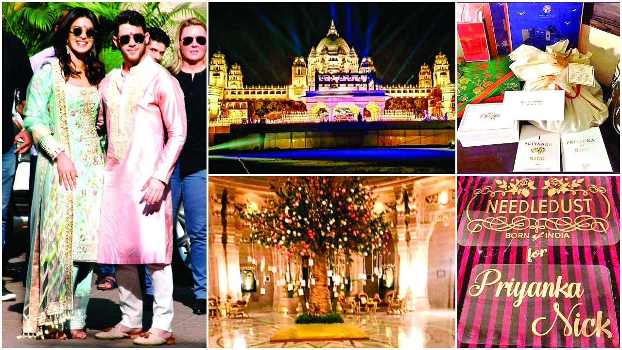 (clockwise): Priyanka Chopra and Nick Jonas; Umaid Bhawan Palace decked up for PC-Nick wedding; and The couple’s kits for their guests