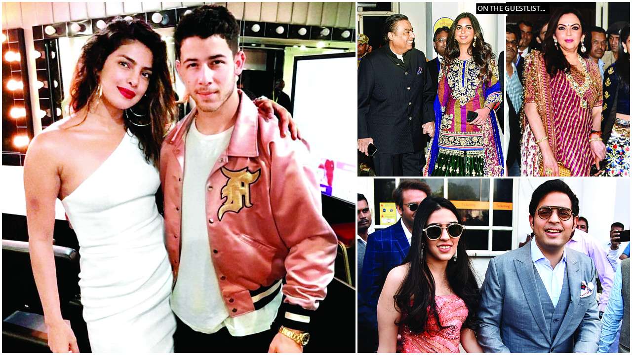(clockwise): Priyanka Chopra and Nick Jonas; On the guestlist: Mukesh Ambani and daughter Isha; Nita Ambani; Shloka Mehta and Akash Ambani
