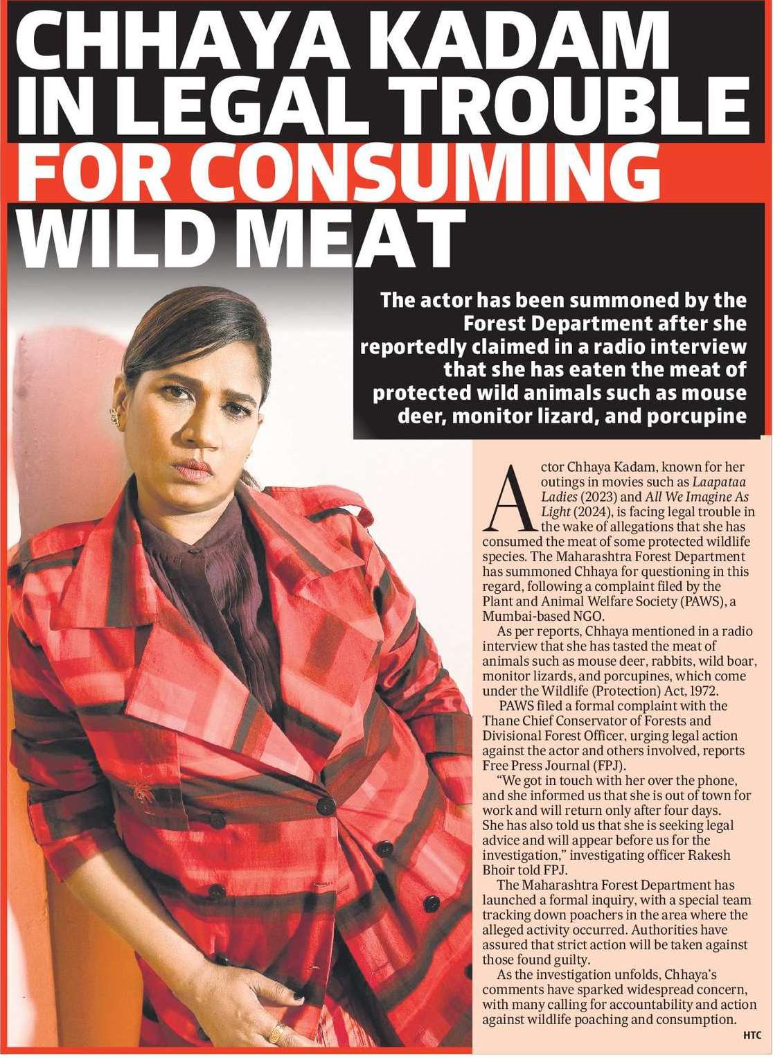 Actor Chhaya Kadam, known for her outings in movies such as Laapataa Ladies (2023) and All We Imagine As Light (2024), is facing legal trouble in the wake of allegations that she has consumed the meat of some protected wildlife species. The Maharashtra Forest Department has summoned Chhaya for questioning in this regard, following a complaint filed by the Plant and Animal Welfare Society (PAWS), a Mumbai-based NGO.